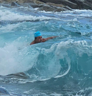 Mare agitato? Non per il noto Messaggero del Mare Pierluigi Costa immortalato nell'"obbligatorio" bagnetto quotidiano, da Luciano, il cugino fotografo.