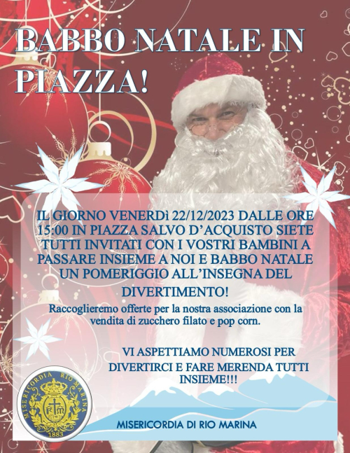 Domani, venerdì 22 dicembre, a partire dalle ore 15:00 in piazza Salvo d'Acquisto a Rio Marina siete tutti invitati con i vostri bambini a passare insieme a noi e Babbo Natale un pomeriggio all'insegna del divertimento.