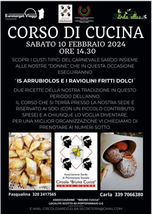 Sabato 10 febbraio a partire dalle ore 14,30, presso la sede sociale in località San Martino 83 a Portoferraio, il circolo culturale sardo "Bruno Cucca" dell'Isola d'Elba propone un laboratorio di cucina sarda su is arrubiolos e i raviolini fritti dolci.