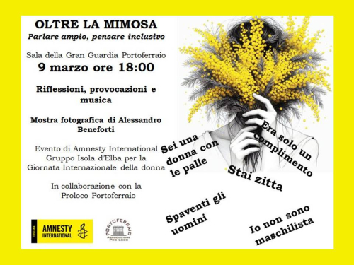 9 marzo, alle 18:00, presso la Sala della Gran Guardia a Portoferraio, si terrà l'evento di Amnesty International Gruppo Isola d’Elba, in collaborazione con la Proloco di Portoferraio, intitolato "OLTRE LA MIMOSA: Parlare ampio, pensare inclusivo". Un'occasione di incontro sul tema della Giornata Internazionale della Donna e di approfondimento sull'importanza del linguaggio inclusivo che aiuta a valorizzare identità ed esperienze di ciascuna persona, favorendo la comunicazione efficace e la comprensione reciproca.