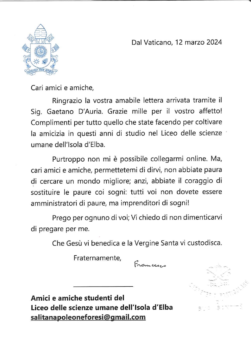 Non abbiate paura di cercare un mondo migliore, abbiate coraggio di sostituire le paure con i sogni. Sembrano frasi di circostanza per infondere positività, ma queste parole non sono comuni, le ha scritte Papa Francesco e le ha inviate agli studenti del liceo delle scienze umane a Portoferraio sulla scalinata Napoleone che lo avevano invitato a collegarsi con loro in video collegamento sul maxi monitor dell'aula magna.