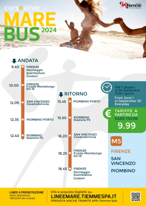 Dal 1 giugno 2024 al 30 settembre 2024 sarà operativo il servizio "MAREBUS 2024" con autobus 50 posti che parte dal Parcheggio Scambiatore Guidoni Aeroporto Amerigo Vespucci-Firenze; orario di partenza alle ore 9.40 ed arrivo a Piombino alle ore 12.40 / ritorno partenza da Piombino alle 15.45 arrivo a Firenze ore 18.45.