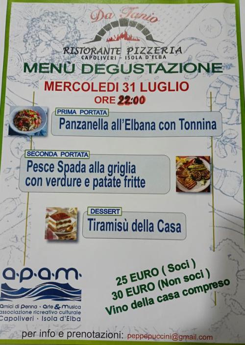 L'Associazione Culturale APAM ("Amici di Penna, Arte & Musica") invita tutti gli interessati a vivere un'esperienza unica conviviale/culturale, mercoledì 31 luglio alle ore 22,00 presso il Ristorante-Pizzeria "Da Tanio" a Capoliveri si terrà la VI° tappa di "CENA a TEMA".
