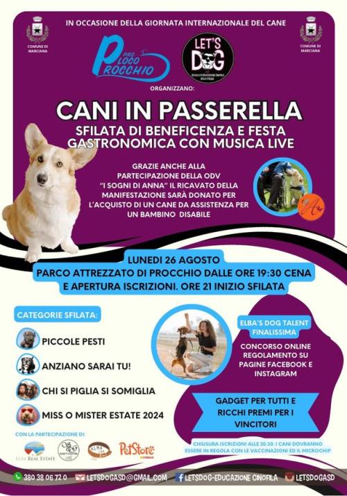 In occasione della festa internazionale del cane, lunedì 26 agosto vi aspettiamo tutti a partecipare alla sfilata organizzata da LET'S DOG ASD grazie alla disponibilità e la collaborazione con la Proloco di Procchio: CANI IN PASSERELLA.