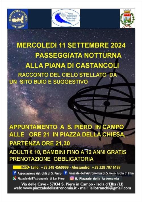 Passeggiata Notturna con gli Astrofili di San Piero. Una camminata facile adatta a grandi e piccini, dopo circa 30 minuti all'arrivo alla Piana di Castancoli, Lettura del Cielo Stellato, vi insegneremo a riconoscere le Costellazioni, i nomi delle Stelle, i colori delle Stelle, la Mitologia e a tanto altro.