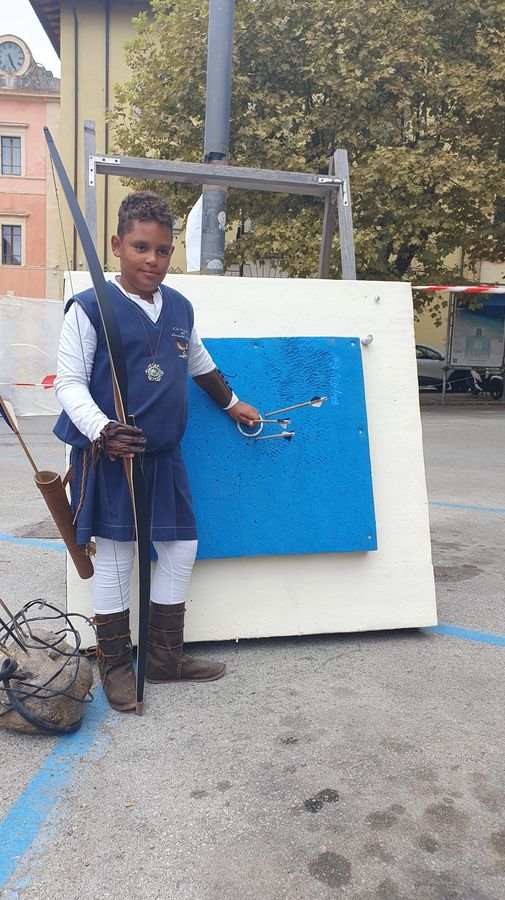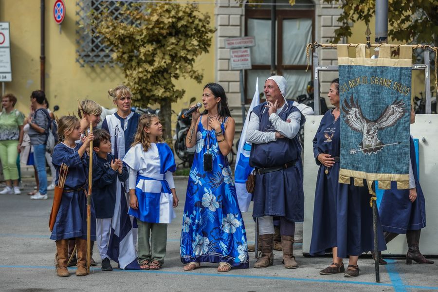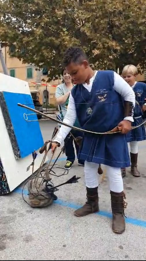 A fianco di tutto ciò, si sono cucinati buoni cibi quale pappa al pomodoro fatta da Alessandra Sbolci che ringraziamo, penne alla matriciana, panini con salsicce alla brace e crepes ai vari gusti e si è servito del buon vino e birra, si è riso, si è scherzato e si è aspettato il momento più atteso, cioè la disfida degli arcieri, ovvero "Il Palio del piccolo arciere", gara ad eliminazione diretta che prevede che tra tutti i piccoli arcieri ne rimanga uno solo, che supera tutte le sfide e che ponga poi una sua freccia nella pietra. La sfida degli under giovanissimi e under 17, prevede che si sfidino fino all'ultima freccia su un bersaglio che diventa sempre più piccolo e ne vincerà così alla fine uno solo, lasciando la freccia nella storia. Quest'anno ha vinto questa importante sfida come l'anno passato l'under 10 Lucio Liberatori, che è anche tra i primi in classifica nazionale Lam (Lega arcieri Medievali italiana) con il suo longbow, ma bravi sono stati anche tutti gli atri under 10 partecipanti come Edoardo Ciomei 2° classificato, Melissa Ciomei 3^ classificata, Alice Lisanti 4^ classificata e gli under 14 quali Tommaso Mazzi e Lorenzo Nuccetelli primi classificati a pari merito e 2° classificato Ivan Volosciuc. La nostra storia che si scrive anno per anno, si catapulta negli anni bui del 1300 che il gruppo del Grande Falco rappresenta con abnegazione, coinvolgendo la piazza , che ormai aspetta l'evento ogni anno.