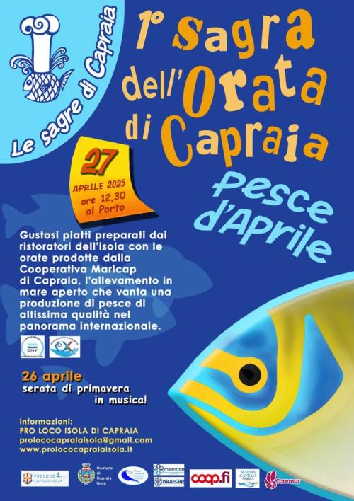 “Con un’altra altrettanto spettacolare festa gastronomica a base di un prodotto locale di eccellenza come l’Orata di Capraia, intendiamo quindi aprire la nuova stagione turistica in un periodo, la primavera, che offre lunghe giornate di luce fatte di escursioni, esplorazioni, passeggiate ma anche di relax e primi assaggi di mare” - dichiara il presidente della Pro Loco, Cosimo Frasciello e aggiunge “oltre alla sagra dell’orata che si terrà sul porto a partire dalle ore 12:30 del 27 aprile, sabato 26/4 è prevista anche una serata di musica in piazza“.