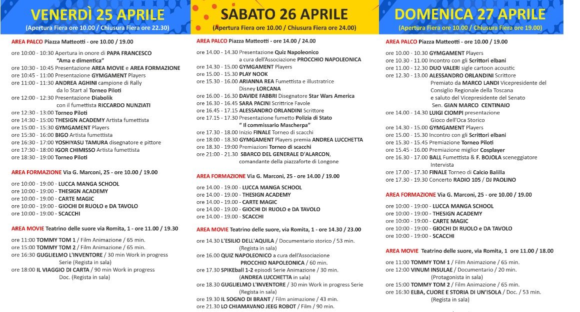 La programmazione di Elbacomics plus players prevista nelle giornate del 25 - 26 - 27 aprile, in ossequio alla morte di Papa Francesco, verrà modificata e ridimensionata.