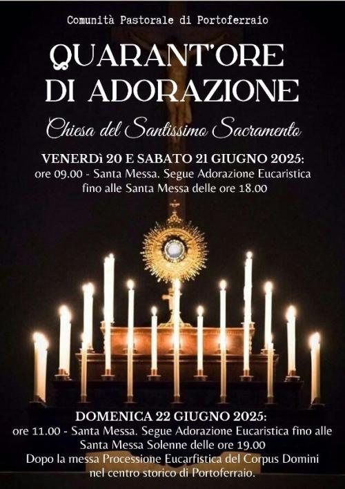 "Nel prossimo fine settimana, - comunica don Kevin - in occasione della festa del Corpo e Sangue di Cristo, Corpus Domini, celebreremo di nuovo la devozione eucaristica delle quaranta ore di adorazione. Si terranno nella Chiesa del Santissimo Sacramento nel centro storico di Portoferraio, con il seguente programma: Venerdì 20 giugno alle 9 sarà celebrata la Santa Messa seguita dalla solenne esposizione del Santissimo Sacramento, che resterà esposto per l'adorazione privata fino alle 18, quando verrà celebrata un'altra Messa e lo stesso programma si ripete sabato 21 giugno. Domenica 22 giugno, sempre al S.S. Sacramento, alle 11 sarà celebrata la Santa Messa, seguita dalla solenne esposizione dell'Eucaristia per l'adorazione privata fino alle 19, quando si celebrerà la Messa solenne seguita dalla tradizionale processione del Corpus Domini nel centro storico".