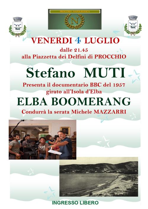 Venerdì 4 luglio, assolutamente da non perdere, la serata programmata dall'Associazione Culturale Procchio Napoleonica con il regista Stefano Muti che, per l'occasione, presenterà il docufilm del 1957 in bianco e nero realizzato dalla BBC all'isola d'Elba, un filmato di grande "amarcord" ed interesse, sia per i nostri curiosi turisti che per tutta la popolazione dell'Elba, attraverso uno "spaccato" di un isola che non c'è più.