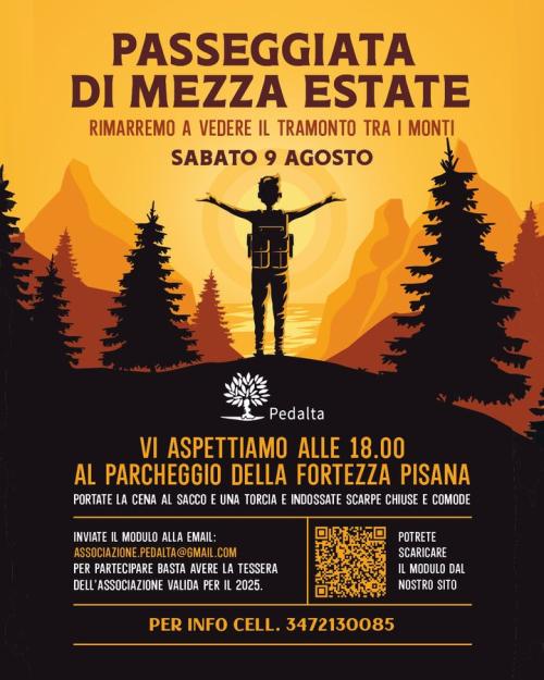 Sabato 9 agosto l’associazione Pedalta invita soci e appassionati della natura a partecipare alla Passeggiata di Mezza Estate, un’occasione speciale per vivere i colori e la magia del tramonto tra i monti.