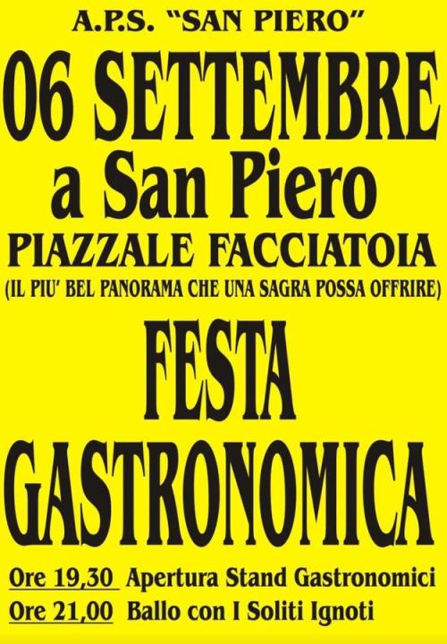 Sabato 6 settembre, a San Piero nel Piazzale Facciatoia, si svolgerà la tradizionale Festa Gastronomica, che unisce buon cibo e divertimento in una location con vista panoramica.