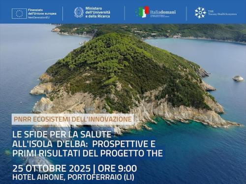 Sabato 25 ottobre a partire dalle ore 9,00, all’Hotel Airone di Portoferraio, si terrà il convegno “Le sfide per la salute all’Isola d’Elba: prospettive e primi risultati del progetto THE (Tuscany Health Ecosystem)”.