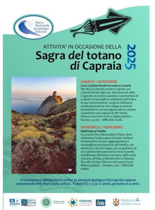 Ecco il programma delle attività del Parco, che affiancheranno e si integreranno con quello della Sagra, disponibile sul sito della Pro Loco di Capraia Isola: https://www.prolococapraiaisola.it/