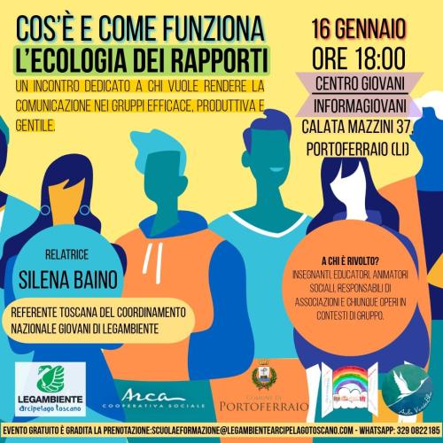 Venerdì 16 gennaio alle ore 18.00 presso il Centro Giovani/Informagiovani del Comune di Portoferraio, in Calata Mazzini 37, avrà luogo l’incontro “Cos’è e come funziona l’ecologia dei rapporti: piccole pratiche di cura nella gestione dei gruppi di lavoro” condotto da Silena Baino, Referente Toscana del Coordinamento Nazionale Giovani di Legambiente.