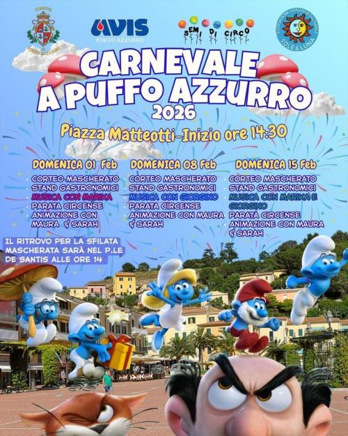 Anche nel 2026 Porto Azzurro si trasforma in un mondo di allegria, musica e fantasia con il Carnevale a Puffo Azzurro: tre domeniche di festa dedicate a grandi e piccini tra cortei mascherati, parate circensi, animazione, musica e stand gastronomici.