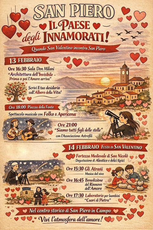 Quando San Valentino incontra San Piero nasce da un percorso condiviso tra istituzioni e cittadinanza “San Piero – Il Paese degli Innamorati”, un progetto culturale, sociale e simbolico che trasforma il borgo di San Piero in Campo in un luogo narrante, capace di raccontare l’amore in tutte le sue forme: affettivo, comunitario, storico, spirituale e territoriale.