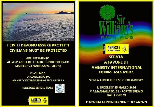 Martedì 24 marzo 2026 alle ore 18:00 si terrà un flash mob sulla Spiaggia delle Ghiaie a Portoferraio per chiedere la protezione dei civili nei conflitti armati. L’iniziativa è promossa da Amnesty International Isola d’Elba in collaborazione con I Messaggeri del Mare, con l’adesione del Forum Elba per la Pace, Elba for Gaza e ANPI.