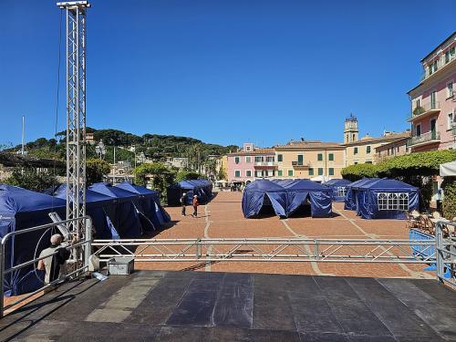 Un colpo d'occhio suggestivo in piazza Matteotti dove gli allestitori degli Elba Comics hanno scelto l'azzurro per ospitare la prima fiera del Fumetto Elbana.