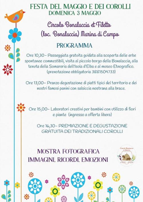 Domenica 3 maggio presso la sede del Circolo in località Bonalaccia a Marina di Campo di terrà la Festa del Maggio e dei Corolli, secondo un simpatico programma di intrattenimento all'insegna delle nostre usanze, del sano divertimento e del buon cibo.