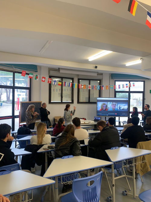 L'evento si è svolto alla presenza della Dirigente Scolastica, di Klaus Dorwarth e Tiziana De Rigo, tramite collegamento online, in rappresentanza del Goethe Insititut di Roma, dei docenti Mereu e Coviello e degli alunni delle due classi.