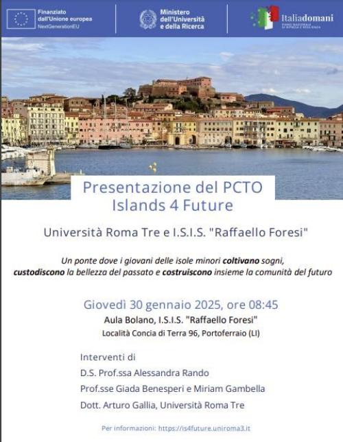 Giovedì 30 gennaio, nell’Aula Bolano dell’I.S.I.S. “Raffaello Foresi” di Portoferraio, si è svolta la presentazione del Percorso per le Competenze Trasversali e l’Orientamento – PCTO- “Islands 4 Future”.