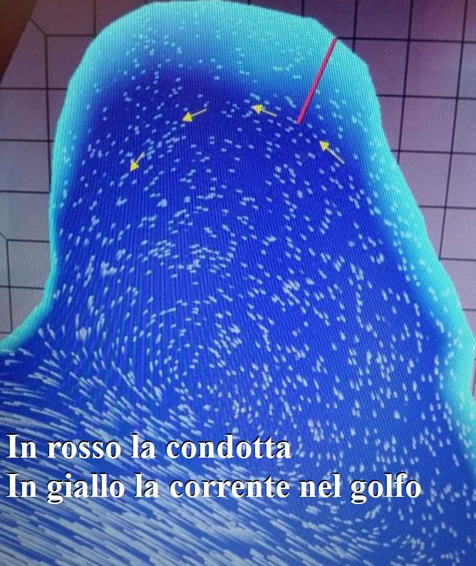 Nel Golfo Stella esiste una corrente a vortice in senso antiorario. L’ipersalinità inizialmente tenderà a spostarsi verso le spiagge di Felciaio, Norsi, Acquarilli e Margidore per poi raggiungere l’Innamorata, Morcone, Pareti, Barabarca e Zuccale e continuare a girare intorno, secondo le correnti dominanti, aumentando sempre di più la concentrazione salina, come si vede dalla foto allegata. In rosso la condotta progettata dello scarico della salamoia e in giallo la corrente che tende a formare il vortice.