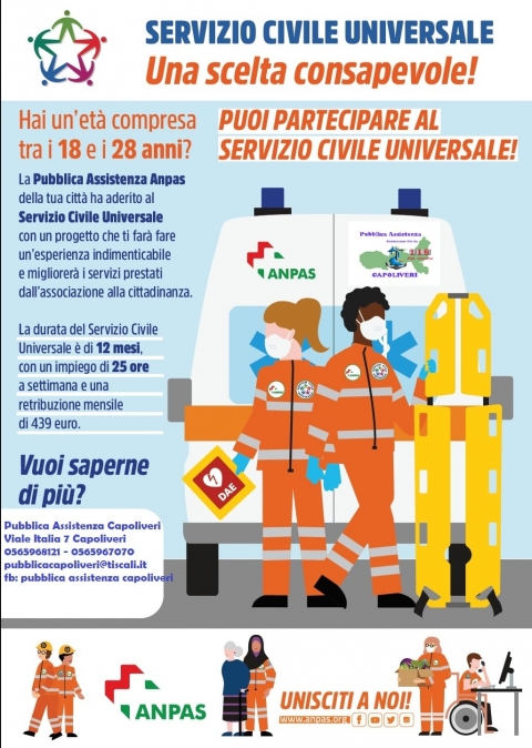 La Pubblica Assistenza di Capoliveri ha aderito al bando Servizio Civile emesso e pubblicizzato dal Dipartimento per le Politiche Giovanili e del Servizio Civile Universale. I posti disponibili nella nostra associazione sono 4 di cui n. 2 orientati all'assistenza sanitaria, n. 1 rivolto al settore di Protezione Civile e n. 1 inerente all'informazione Elba quest'ultimo è riservato alle categorie fragili.