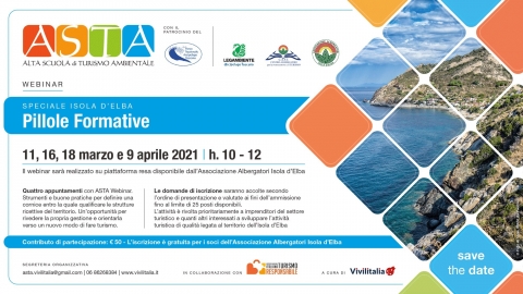 Dopo il primo tenutosi l’11 marzo, continuano gli appuntamenti con Speciale ASTA Webinar Isola d’Elba “Pillole Formative”, curati da ASTA – Alta scuola di turismo ambientale e Vivlitalia Turismo Ambiente in collaborazione con Legambiente Arcipelago Toscano, Centro Albergatori per la formazione e il turismo – Associazione Albergatori Isola d’Elba e con il patrocinio del Parco Nazionale dell'Arcipelago Toscano.