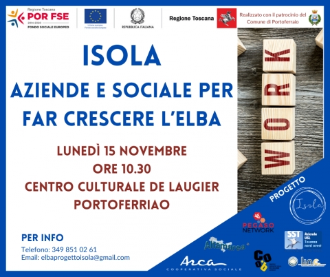 Lunedì 15 novembre alle 10.30 presso il Centro Culturale De Laugier a Portoferraio sarà presentato I.SO.LA. “Inclusione SOciale attraverso il LAvoro”, un nuovo progetto in partenza sul territorio dell’isola d’Elba. Il progetto vede impegnate diverse cooperative che operano sul territorio (Pegaso Network, Cooperativa LINC, Cooperativa Altamarea, Cooperativa Arca, Consorzio COOB) e ASL distretto Elba, in stretta sinergia con le aziende locali.