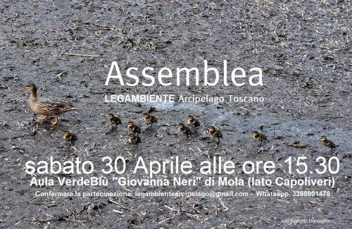 L'Assemblea ordinaria dei Soci di Legambiente Circolo Arcipelago Toscano è convocata per sabato 30 Aprile alle ore 15.30, all’Aula VerdeBlu "Giovanna Neri" di Mola (lato Capoliveri). La presidente di Legambiente Arcipelago Toscano, Maria Frangioni, spiega che «Sarà : un'occasione per fare il punto sulla situazione ambientale sulla nostra Isola, sulle molte iniziative in atto ed in programma, sui rapporti con la cittadinanza e le Istituzioni, ma anche per godersi la zona umida, in pieno rigoglio dal punto di vista naturalistico, e la struttura che abbiamo in concessione dal PNAT e che sta diventando ogni giorno di più un interessante centro culturale ambientale ed un luogo gradevole».