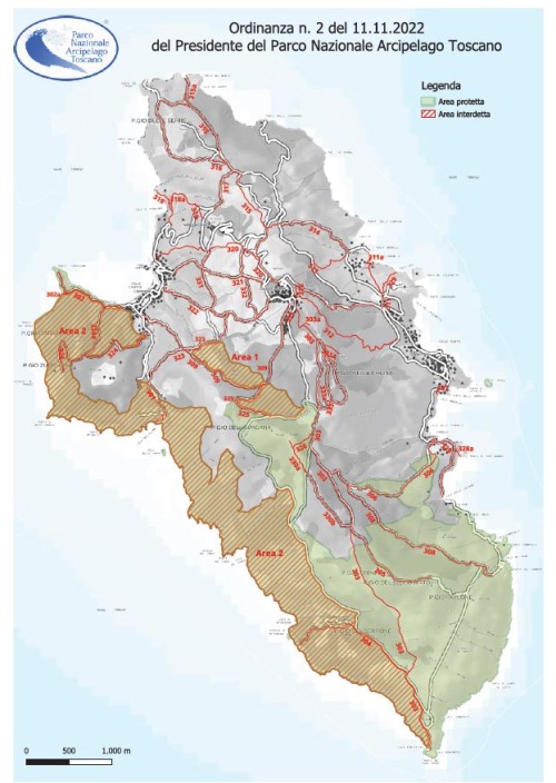 Il provvedimento stabilisce che nei periodi temporali compresi tra la data odierna e il 16.12.2022 e tra il 09.01.2023 e il 28.02.2023 sarà vietato a chiunque l’accesso nelle due aree del Parco Nazionale situate nel settore centrale e occidentale/sud-occidentale dell’Isola del Giglio ed evidenziate nella mappa allegata,