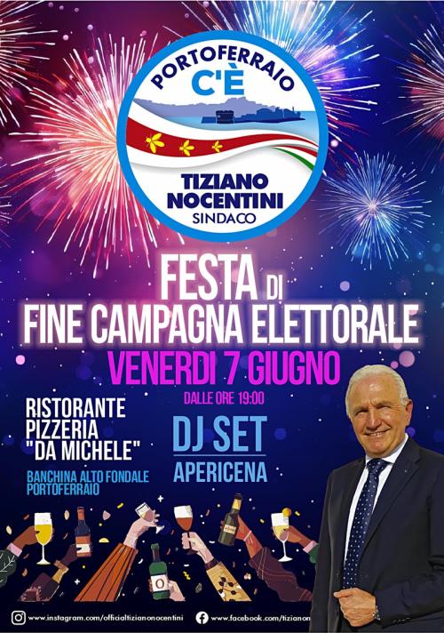 Si terrà dalle 19 di venerdì 7 giugno 2024 presso il Ristorante Pizzeria “da Michele”, alla Banchina Alto Fondale, la Festa di fine Campagna Elettorale organizzata dalla lista civica “Portoferraio c’è”.