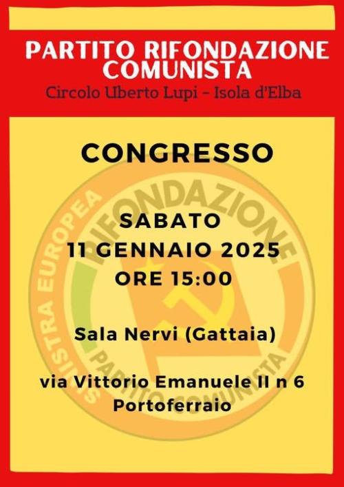Si terrà sabato 11 gennaio 2025 dalle ore 15 in poi presso la Sala Nervi (La Gattaia) in Via Vittorio Emanuele II n.6 a Portoferraio il Congresso del Circolo Isola d’Elba del Partito della Rifondazione Comunista.