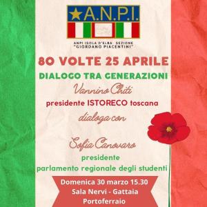 L’ANPI Isola d’Elba “Giordano Piacentini” vi invita domenica 30 marzo 2025 alle ore 15,30 presso la “Gattaia” di Portoferraio a un dialogo sulla Resistenza con Vannino Chiti, presidente dell’Istituto storico della Resistenza e della Contemporaneità della Toscana e Sofia Canovaro, presidente del Parlamento Regionale degli Studenti della Toscana.