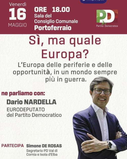 Il Partito Democratico dell'Isola d'Elba informa che venerdì 16 maggio, alle ore 18, presso la Sala Consiliare del comune di Portoferraio, si terrà un incontro con Dario Nardella dal titolo "Si, ma quale Europa? - L'Europa delle periferie e delle opportunità in un mondo sempre più in guerra".