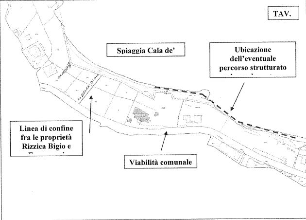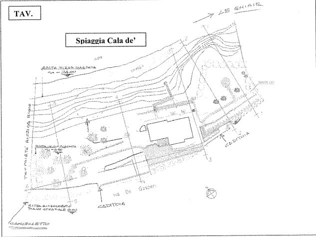 Il dislivello esistente dal piano stradale, in corrispondenza del confine tra la proprietà Rizzica-Bigio/Fragomeni (Tav. A) fino alla spiaggetta è di ca. int. 24,00 con un dislivello intermedio dal piano stradale alla proprietà Fragomeni di ca. mt. 6,00.
