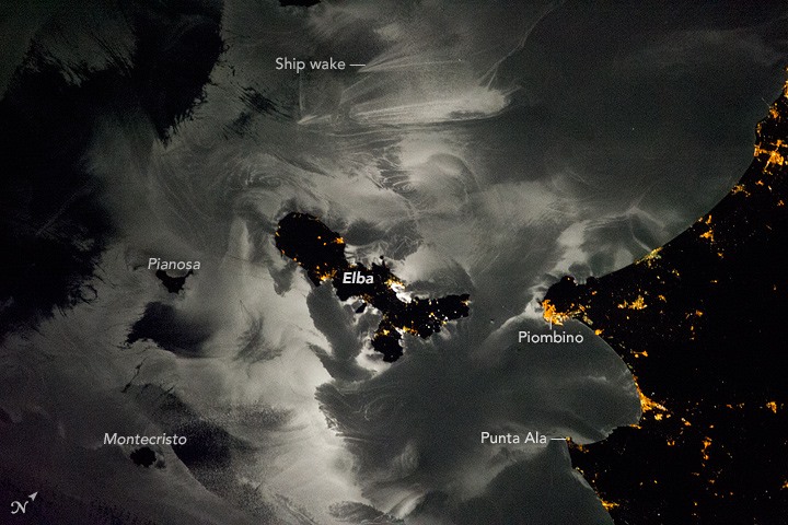 Un membro dell'equipaggio a bordo della Stazione Spaziale Internazionale ha scattato questa fotografia del Mar Mediterraneo settentrionale, dove si vedono alcune città italiane costiere ed alcune isole dell'Arcipelago Toscano, l'Elba in primo piano.