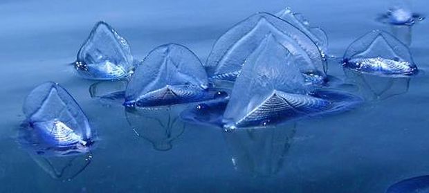 Più che un un singolo animale la velella (a forma di dischetto ovale, diametro di 4-7 cm, sormontato da una cresta verticale che sembra una vela di un minuscolo scafo) si può definire una "cooperativa". Al di sotto della vela verticale, composta dalla forma medusoide, sono presenti infatti vari zoidi che svolgono diverse funzioni: gastrozoidi (con funzioni nutritizie), dattilozoidi (con funzioni difensive) e gonozoidi (con funzioni riproduttive).