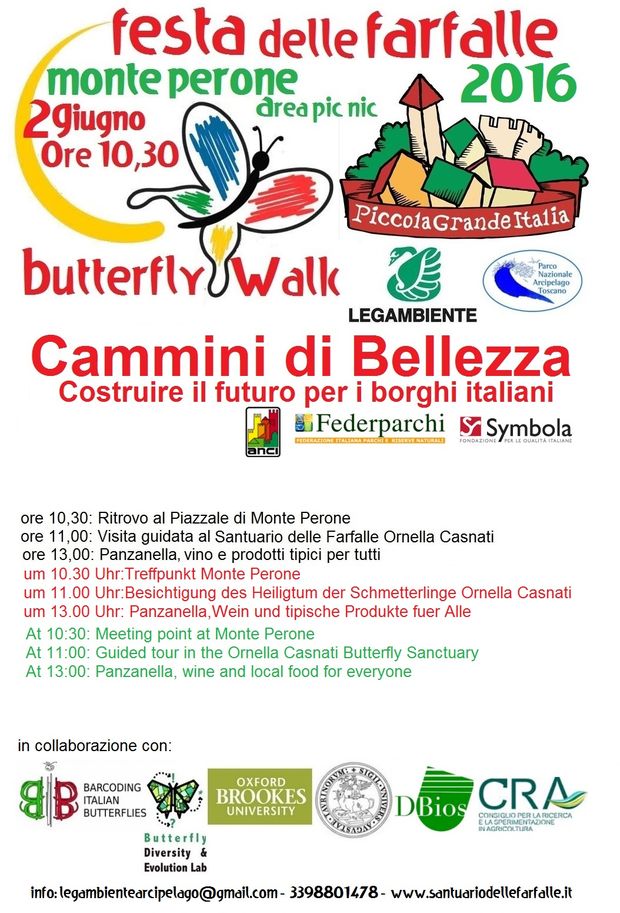 In occasione della Giornata Mondiale della biodiversità, Legambiente ha pubblicato il dossier “Biodiversità a rischio”, un’analisi sullo stato della tutela della biodiversità in Italia, che contiene una scheda sulle farfalle dell’Arcipelago Toscano e sulle ricerche scientifiche realizzate partendo dall’esperienza del Santuario delle Farfalle Ornella Casnati di Monte Perone, all’Isola d’Elba, dove il 2 giugno, a partire dalle 10,30 si terrà l’ormai tradizionale Festa delle Farfalle, con Butterfly Walk e vista guidata e che si concluderà con panzanella, vino e prodotti tipici per tutti.