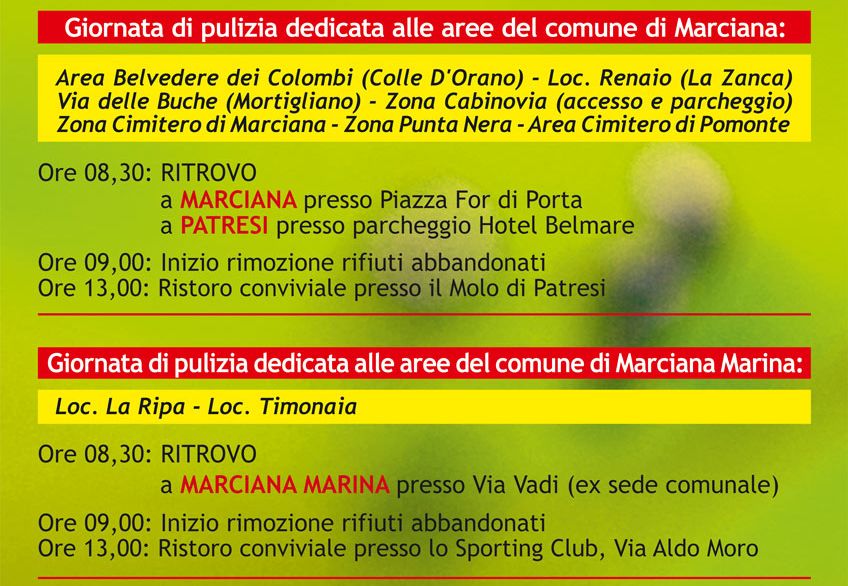Per il secondo anno prosegue la manifestazione 10.000 MANI PER L'ELBA, evento promosso dalla Prefettura di Livorno, Uff. staccato dell'Elba, in collaborazione con comuni di Marciana e Marciana Marina, società di raccolta rifiuti ESA, Parco Nazionale dell'Arcipelago Toscano, Corpo Carabinieri Forestali, Vigili del fuoco, Esercito Italiano e le associazioni del versante occidentale.