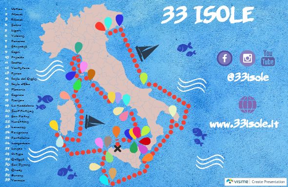 33 Isole è un progetto di viaggio. Un viaggio insolito di Lucio Bellomo attraverso tutte le isole minori italiane abitate, su una piccola e originale barca a vela, senza cabina e in solitaria. Alla scoperta, più che degli echi del passato, del futuro di queste isole e di quei giovani che, spinti da un fortissimo senso di appartenenza, hanno deciso di realizzarvi sogni ambiziosi, moderni, innovativi. La fotografia di un'Italia e di un Mediterraneo apparentemente marginali eppure reali, vivi; importanti.