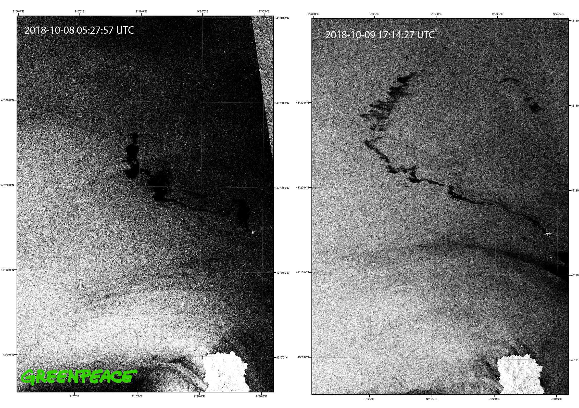 Una elaborazione di Greenpeace effettuata su immagini satellitari rivela che la contaminazione di idrocarburi rilasciati dalla collisione tra il portacontainer Virginia e il traghetto Ulysses, circa trenta chilometri a nord ovest di Capo Corso, in pieno Santuario dei Cetacei, riguarda ormai un'area superiore ai 100 chilometri quadrati. Le immagini mostrano infatti che l’area interessata dalla contaminazione è passata dai circa 88 chilometri quadrati dell’8 ottobre ai 104 chilometri quadrati di ieri, 9 ottobre.