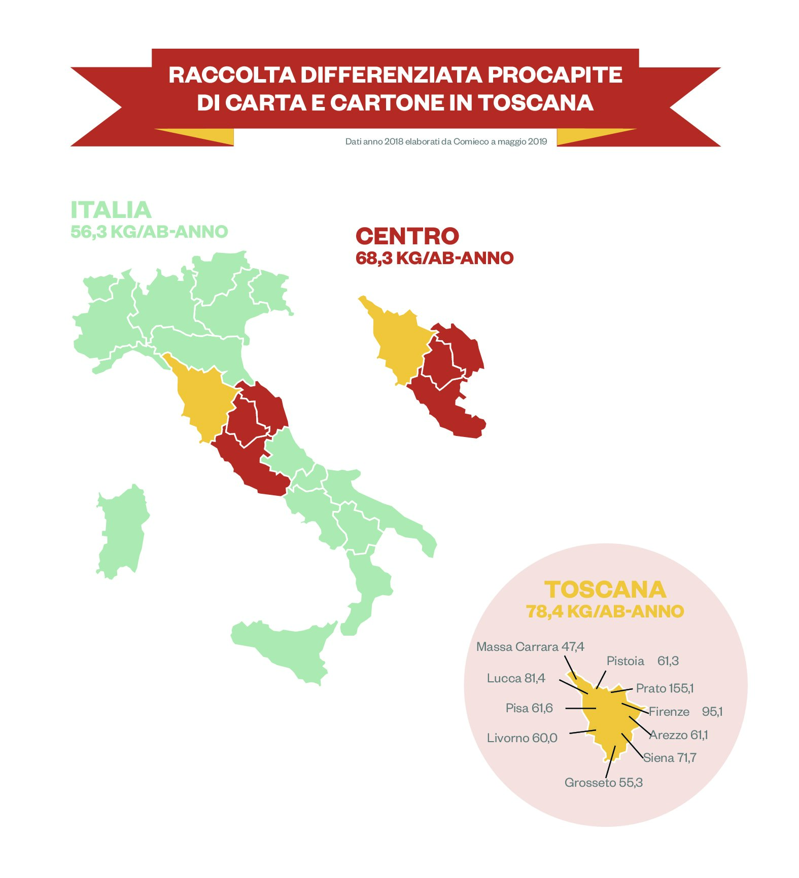 La Toscana si conferma una delle regioni più performanti d’Italia nella raccolta differenziata di carta e cartone con una raccolta superiore a 295 mila tonnellate e un pro capite di 78,4 kg/ab. Un ottimo risultato se confrontato con la media nazionale pari a 56,3 kg/ab. E’ quanto emerge dal 24° rapporto nazionale presentato da Comieco, Consorzio Nazionale per il Recupero e Riciclo degli imballaggi a base cellulosica, che a livello nazionale rileva una raccolta complessiva di 3,4 mln ton di carta e cartone con una crescita del 4% rispetto al 2017.