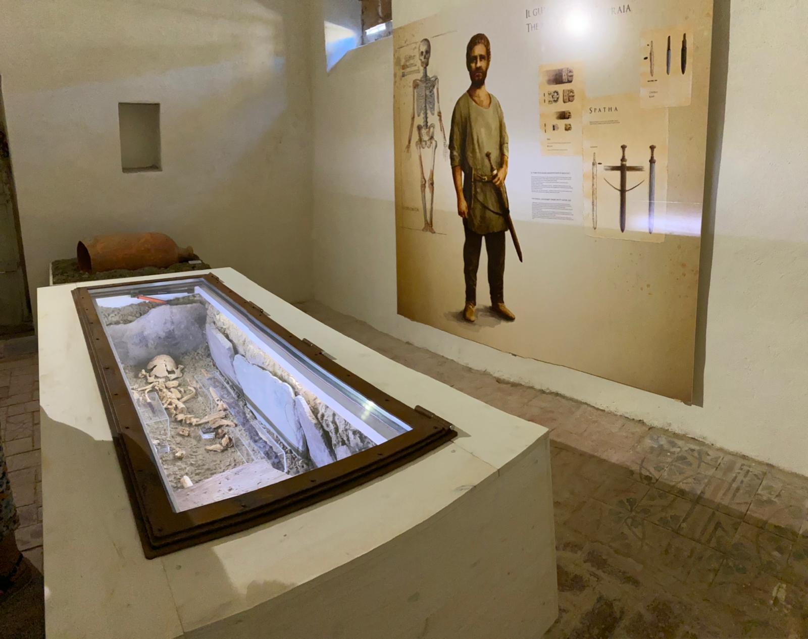 Fra questi, i più suggestivi provengono dalla cosiddetta Tomba del Guerriero, scoperta nel sagrato della Chiesa di Santa Maria Assunta durante i lavori Enel nel 1988. Al suo interno fu recuperato un importante corredo costituito da due fibbie per cintura di diverse dimensioni, in bronzo dorato con incastonati degli almandini e con chiodini bronzei ai lati per il fissaggio alla cintura; una spada di ferro con fodero ligneo, rivestita all’imboccatura da una lamina di bronzo argentato decorata con fregio di ovoli e linee parallele a zig-zag; un coltello in ferro, anch’esso con fodero ligneo. Armi e fibbie sono da attribuire a manifatture imperiali della Gallia. I resti dello scheletro ed il corredo permettono di attribuire la sepoltura ad un militare di 25-30 anni, alto circa 174 cm, di origine probabilmente non autoctona, forse un Franco dell’esercito imperiale di Avito, morto durante la battaglia della Corsica del 456 d.C. contro una la flotta vandala partita da Cartagine per saccheggiare la Gallia o l’Italia.