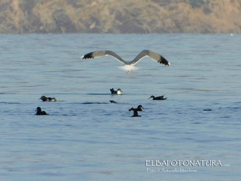 Sono fermo intento a documentare l’evento che non avevo mai osservato: avevo ritratto le berte maggiori diverse volte dai traghetti o da altri natanti, oppure tra l’Elba e Pianosa meno numerosi gruppetti di berte minori, di passaggio e abbastanza schive, mentre qui sono molto tranquille, forse per la giornata così piacevole, più probabilmente per il cibo abbondante e disponibile … Ad un certo punto le sbollature sono anche intorno a me … e le berte si avvicinano abbastanza incuranti della mia barchetta ormai ferma, appena trasportata dalla corrente e approfitto per scattare altre immagini finché, sempre volando e tuffandosi appena, si spostano seguendo le loro prede verso la costa in direzione di Nisporto. Non voglio inseguirle certo che eventuali sforzi sortirebbero l’effetto opposto facendo scappare gli animali e rovinandogli il prezioso banchetto. Il sole è ancora caldo e piacevole, non resta che proseguire la navigazione.