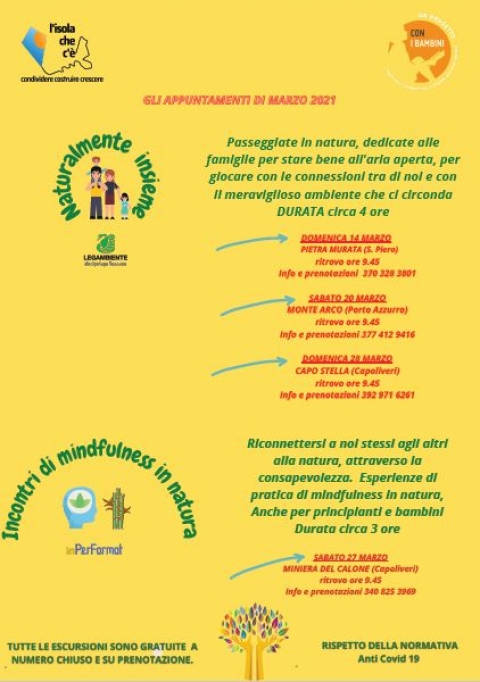 Tornano nel mese di marzo le 'escursioni per famiglie'. Si tratta di esperienze in natura proposte da Legambiente Arcipelago Toscano alle famiglie che seguono L'Isola che c'è, progetto sostenuto dall'impresa sociale Con i Bambini nell'ambito del Fondo per il contrasto della povertà educativa minorile, di l'associazione è partner.
