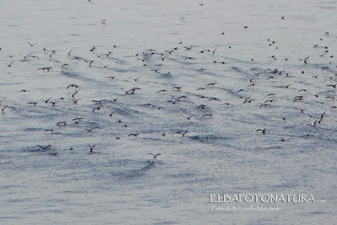 Avevo già documentato un nutrito gruppo di berte minori (Puffinus yelkouan) in una piccola galleria fotografica pubblicata a fine febbraio scorso, testimonianza accompagnata anche da un dettagliato articolo dell'esperto ornitologo Giorgio Paesani che aveva descritto l'interessante specie dal punto di vista biologico e conservazionistico. Ma allora si trattava solo di 30 - 40 esemplari ritratti in una giornata di mare calmo poco al largo del faro portoferraiese. Ben poco a confronto del grande stormo di questi uccelli pelagici incontrati al largo di Nisportino domenica scorsa. Erano passate da poco le 18, quando sul mare piatto come una tavola del 25 aprile gli osservatori più attenti presenti sul traghetto per Piombino potevano notare in lontananza delle leggere increspature. I più hanno pensato ad una “mangianza a galla” da parte di qualche specie ittica, ma quando la motonave si è avvicinata un gruppo composto da quasi 200 esemplari di berta minore - forse in fase di “luna di miele” ha suggerito Giorgio Paesani - ha iniziato il decollo in massa, “rigando” letteralmente la superficie marina. Ecco alcune immagini del fortunato incontro.