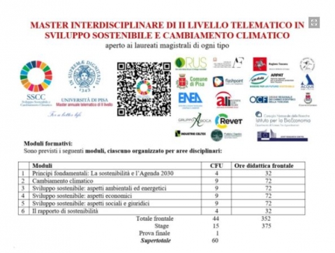 Il Master su Sviluppo Sostenibile e Cambiamento Climatico (MSSCC) è un corso Master di secondo livello dell’Università di Pisa, della durata di un anno, rivolto a professionisti e neolaureati in possesso di laurea magistrale. Considerando il carattere spiccatamente interdisciplinare del percorso didattico, ispirato all’Agenda 2030 e agli Obiettivi di Sviluppo Sostenibile delle Nazioni Unite, il corso è aperto a tutti i potenziali interessati in possesso del titolo richiesto in qualsiasi disciplina.