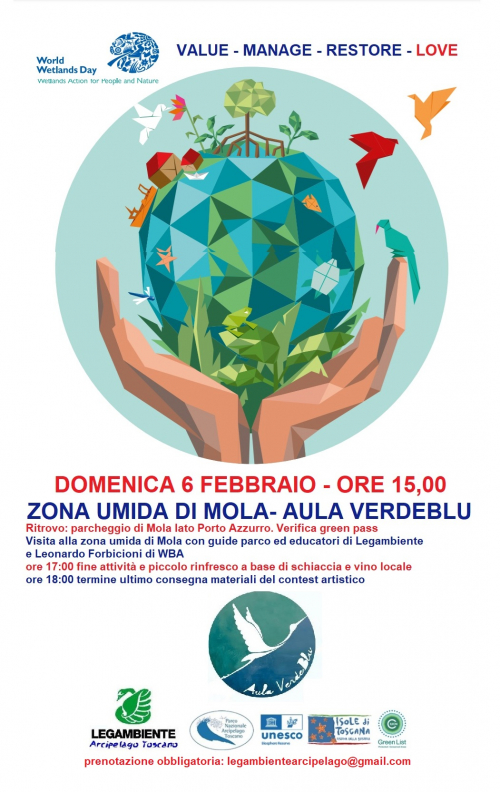 Ore 15:00 ritrovo presso il parcheggio di Mola lato Porto Azzurro, verifica green pass, partenza a piccoli gruppi per la visita alla zona umida di mola attraverso varie stazioni in cui guide parco ed educatori di Legambiente proporranno attività di interpretazione ambientale, adatte ad adulti e bambini, che permetteranno a tutti di apprezzare l’importanza delle zone umide in generale ed in particolare di quella di Mola. All’Aula VerdeBlu sarà presente anche Leonardo Forbicioni esperto entomologo, vicepresidente di WBA (World Biodiversity Association) e curatore del NatLab di Forte Inglese Portoferraio.